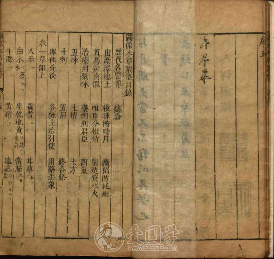 内容:全书共 12 卷,卷首列历代名医图 14 幅。正文收药 448 种,附录 388 种,分为草、木、谷、菜、果、石、兽、禽、虫鱼、人等 10 部。每药述其气味、阴阳升降、良毒、归经、产地、形态、炮制、功效、主治、用药配伍等,并附 “谟按”。书中采用不规则的对语体裁,便于初学,还附有 559 幅图,其中药材图 30 余幅。