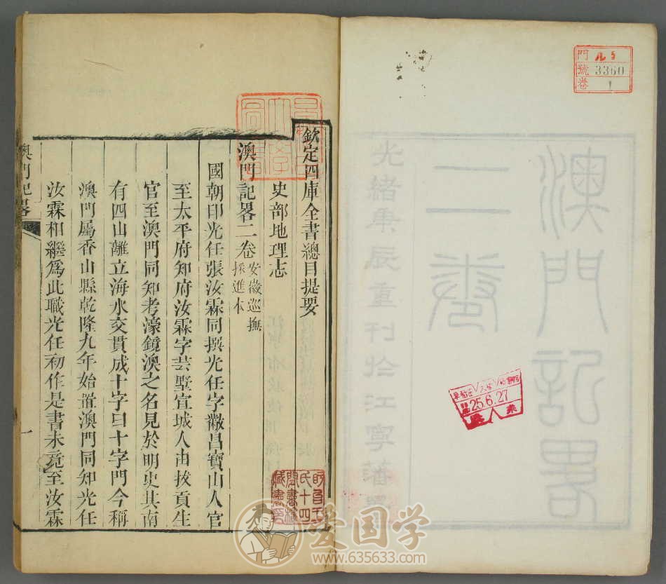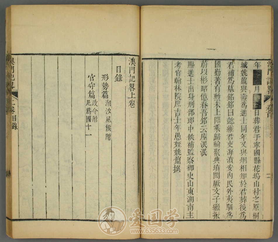内容:《澳门记略》亦作《澳门纪略》,是世界和中国历史上第一部系统介绍澳门的古籍著作。全书共三篇,分上下两卷。上卷包括《形势篇》和《官守篇》,《形势篇》主要介绍澳门及附近地方的地理、气候与军事布防等;《官守篇》主要介绍澳门的历史沿革,明朝与清朝的管治、相关政令与历史事件等。下卷为《澳蕃篇》,详述外蕃的贸易往来、宗教信仰和传教士在中国的风俗习惯等,还附有插图 21 帧和 400 多条中葡对照词语。此版为光绪六年刻本。