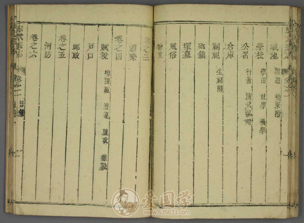 • 学校:卷五记学宫、书院、义学、祀典,补充礼乐、卹政等政教内容,完善地方教育史料。