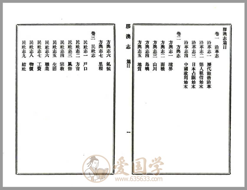 - 卷一 沿革志:历代沿革、德人租借始末、日本占据始末、中国收回始末
