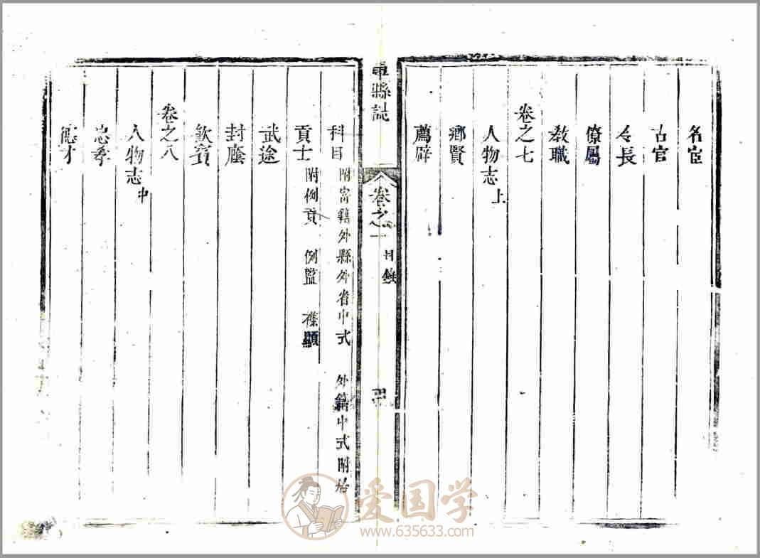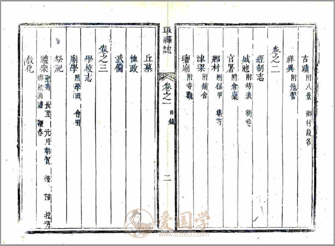 内容:记载本地历史、地理、人文、社会、方舆等全面情况。